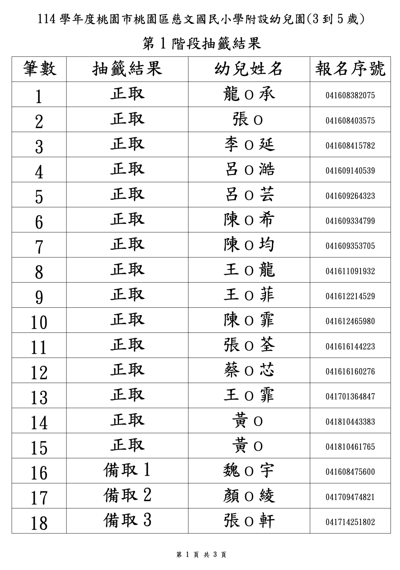【公告114學年度慈文國小附設幼兒園第一階段錄取名單】