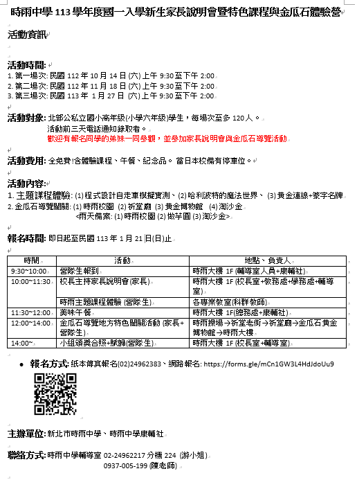 四、 | 活動地點:新北市私立時雨中學、新北市立黃金博物園區 |