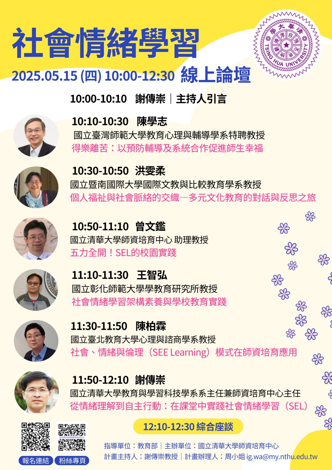 一、 | 清華大學師資培育中心舉辦之論壇以「社會情緒學習」為主題,旨在探討如何透過系統性教學,培養學生的自我覺察、情緒管理、人際互動與責任決策能力。透過專家講座與實務交流,期能協助教師深化SEL理念與教學策略,進而促進學生全人發展,強化學校教育支持系統。 |