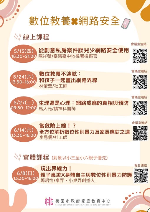 二、 | 課程詳細資訊,請見中心課程行事曆(https://reurl.cc/xlGyGL )或追蹤「桃園市政府家庭教育中心」FB粉絲專頁;另倘有家庭教育個別化服務需求,可撥打4128185家庭教育諮詢專線,本市市民可申請小桃家線上諮詢室(預約連結:https://reurl.cc/oZWOY5 ),由中心媒合專業人員透過線上會議室提供服務。 |