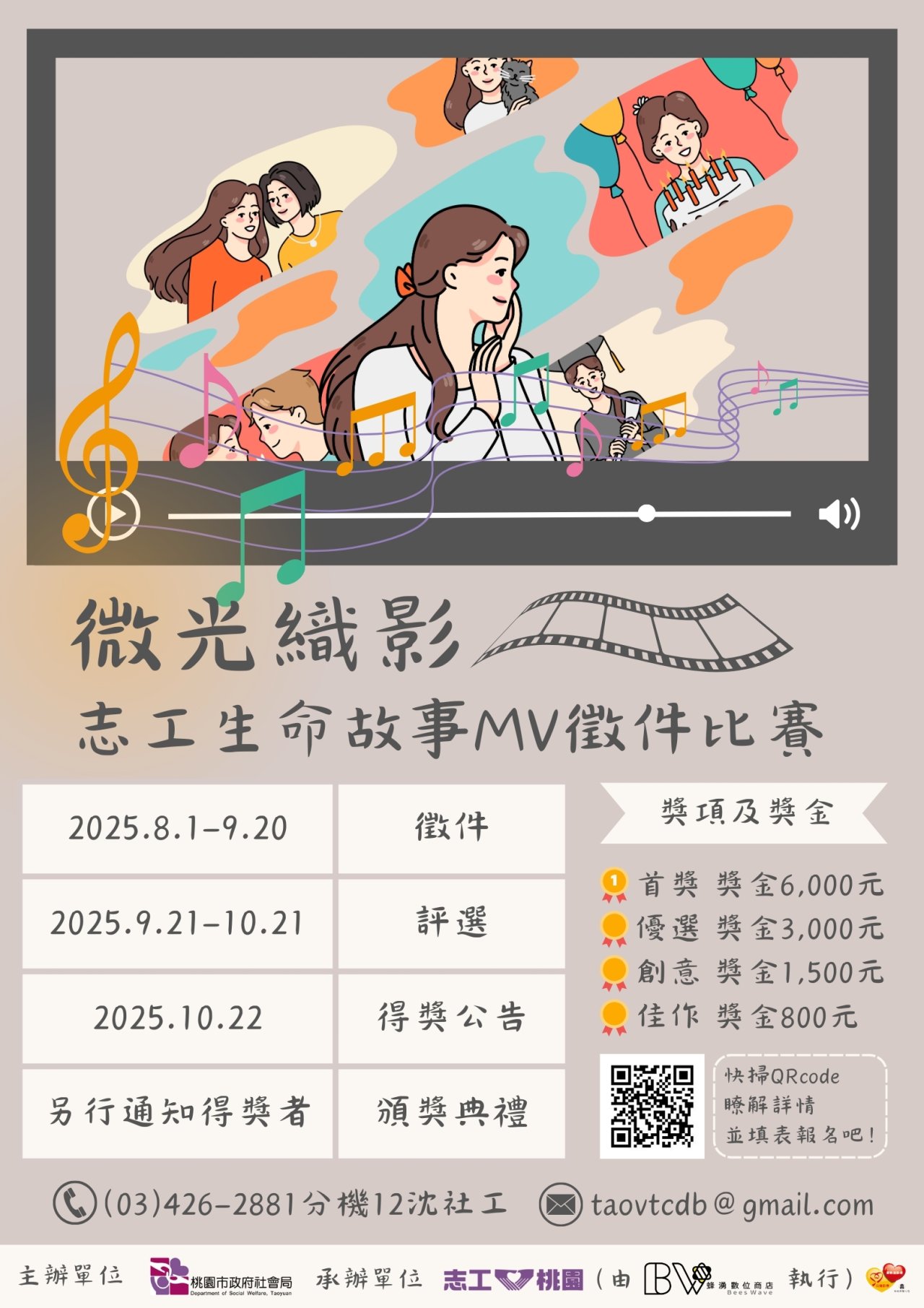 | 2、 | 將作品上傳至Google雲端硬碟,權限請開啟檢視與下載功能,並將雲端網址寄至志推中心公務信箱「taovtcdb@gmail.com」,信件主旨請註明「114年微光織影—志工故事MV徵件比賽_參賽者姓名」。 |