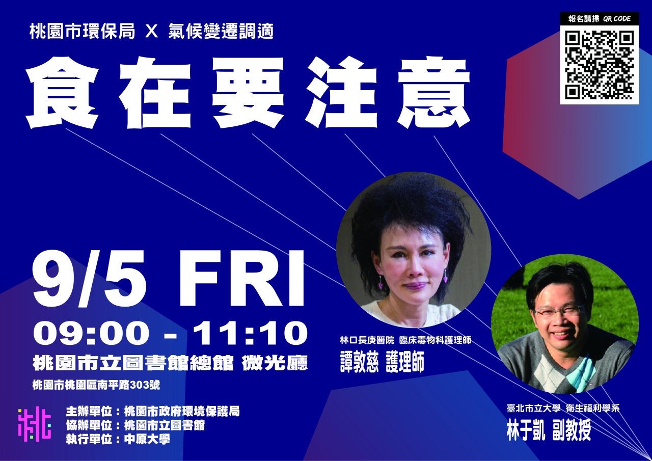三、 本次工作坊特別邀請氣候變遷研究學者-臺北市立大學林于凱教授以及無毒教母-林口長庚臨床毒物中心的譚敦慈護理師擔任講座,分享氣候變遷調適新知以及極端氣候下的家庭健康飲食,成就永續健康人生。