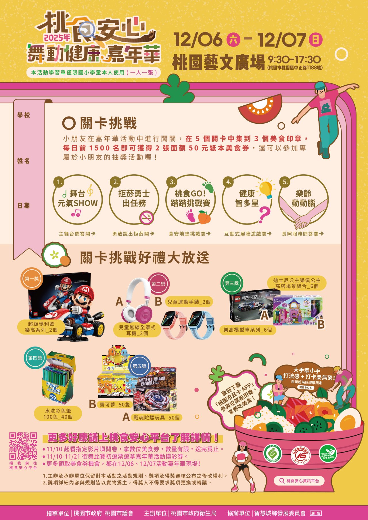 三、 本活動自114年11月10日起於桃食安心資訊平台另有獲得美食券及摸彩劵之活動訊息,即「看影片,填問卷」和「街舞比賽初賽票選」等,歡迎鼓勵學童與家長共襄盛舉。