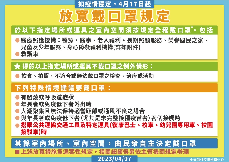 二、 | 嚴重特殊傳染性肺炎中央流行疫情指揮中心於112年4月7日公布調整之防疫措施:自112年4月17日起實施公共運輸戴口罩放寬之通案性規定,搭乘公眾運輸工具及特定運具(如校車、幼兒園專用車、校園接駁車),建議佩戴口罩;進入校園內健康中心,比照指揮中心規範之指定場所(醫療照顧機構),依規定仍應佩戴口罩。 |