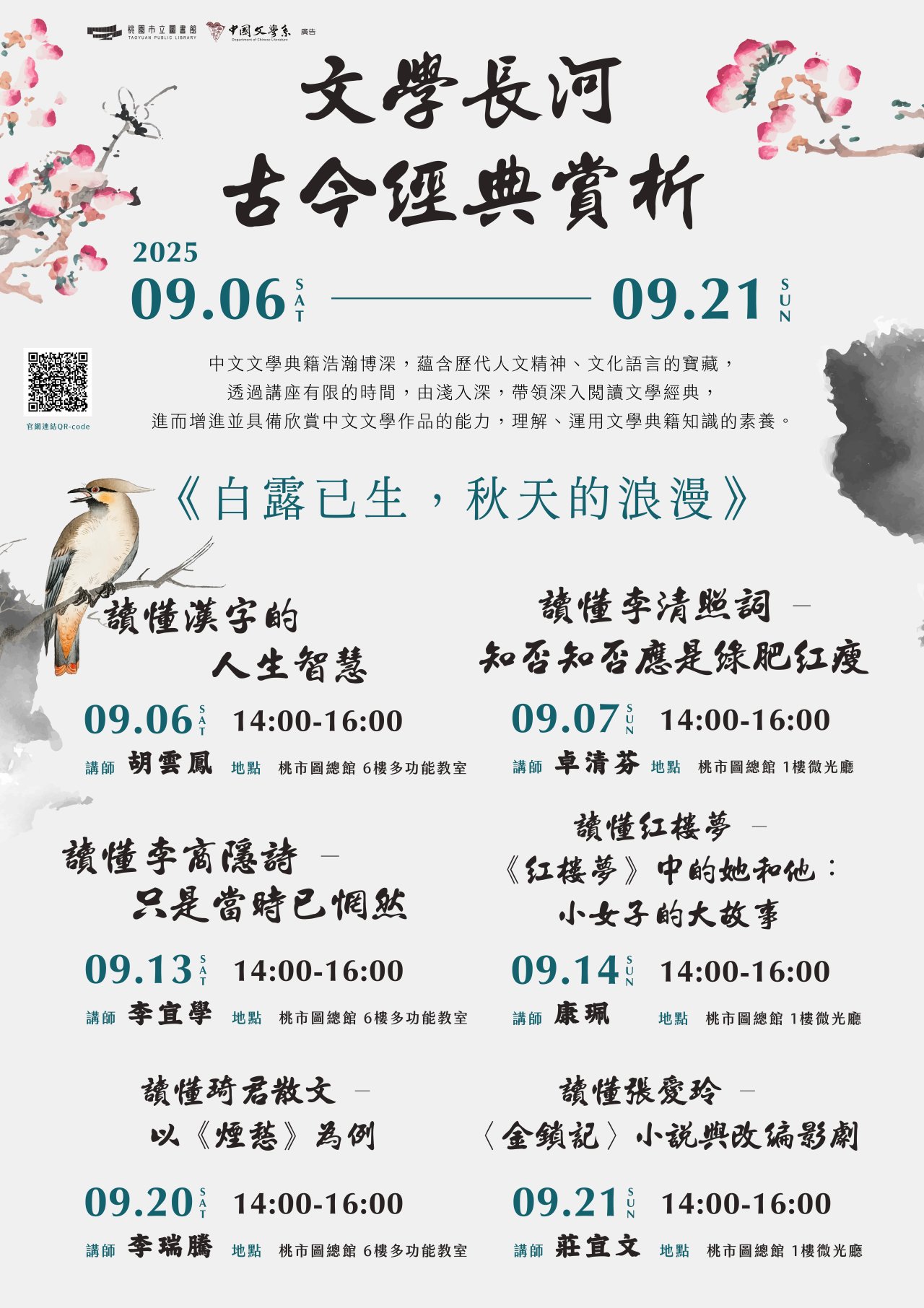 轉知桃園市立圖書館辦理「文學長河 古今經典賞析」兩波講座,說明如下: